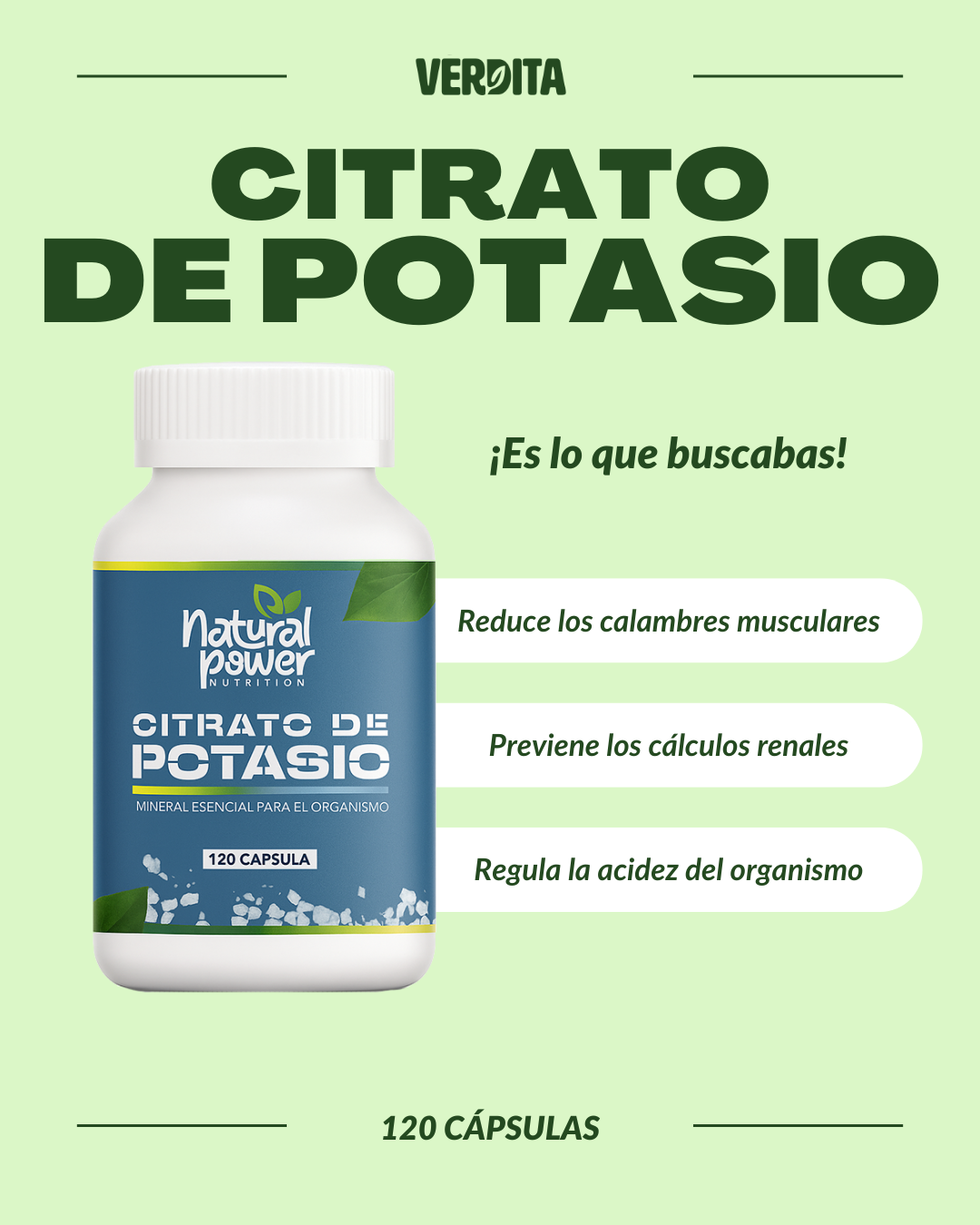 El citrato de potasio en capsulas es una forma altamente absorbible de potasio, esencial para varias funciones corporales. Natural Power lo ofrece en cápsulas para uso diario, enfocándose en el apoyo muscular, renal y cardíaco.