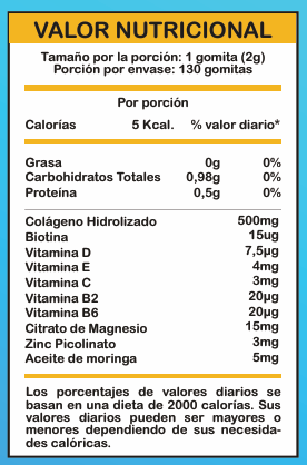 Gelatina, glucosa, miel de abeja, azúcar, almidón, pectina, agua, panela, aceite de moringa, colágeno hidrolizado, vitamina C, vitamina D3, vitamina E, vitamina B2, vitamina B6, citrato de magnesio, zinc picolinato, glucósidos de esteviol, ácido cítrico, colorante carmín (SIN 120), sorbato de potasio.