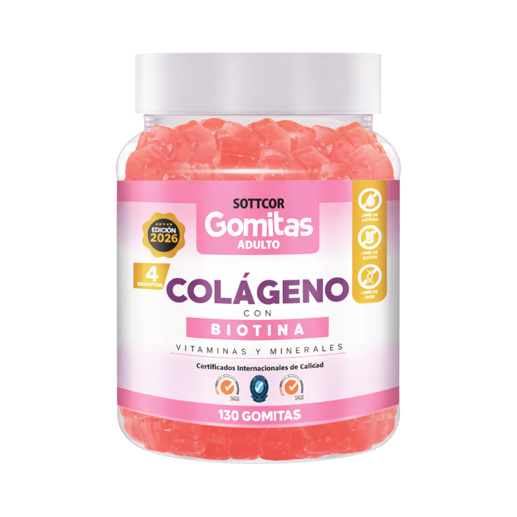 Las Gomitas Colageno combinan colágeno hidrolizado con biotina, vitaminas C, D, E, complejo B, zinc y citrato de magnesio en una práctica presentación masticable. Su fórmula está diseñada para complementar la alimentación diaria y apoyar la salud de la piel, el cabello, las uñas y las articulaciones.