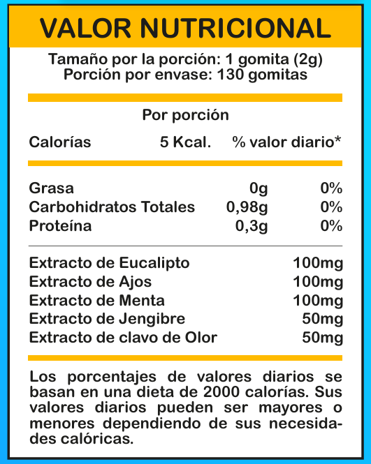Envase con 130 gomitas sabor menta con eucalipto, rotulado con información completa sobre ingredientes, uso y advertencias.