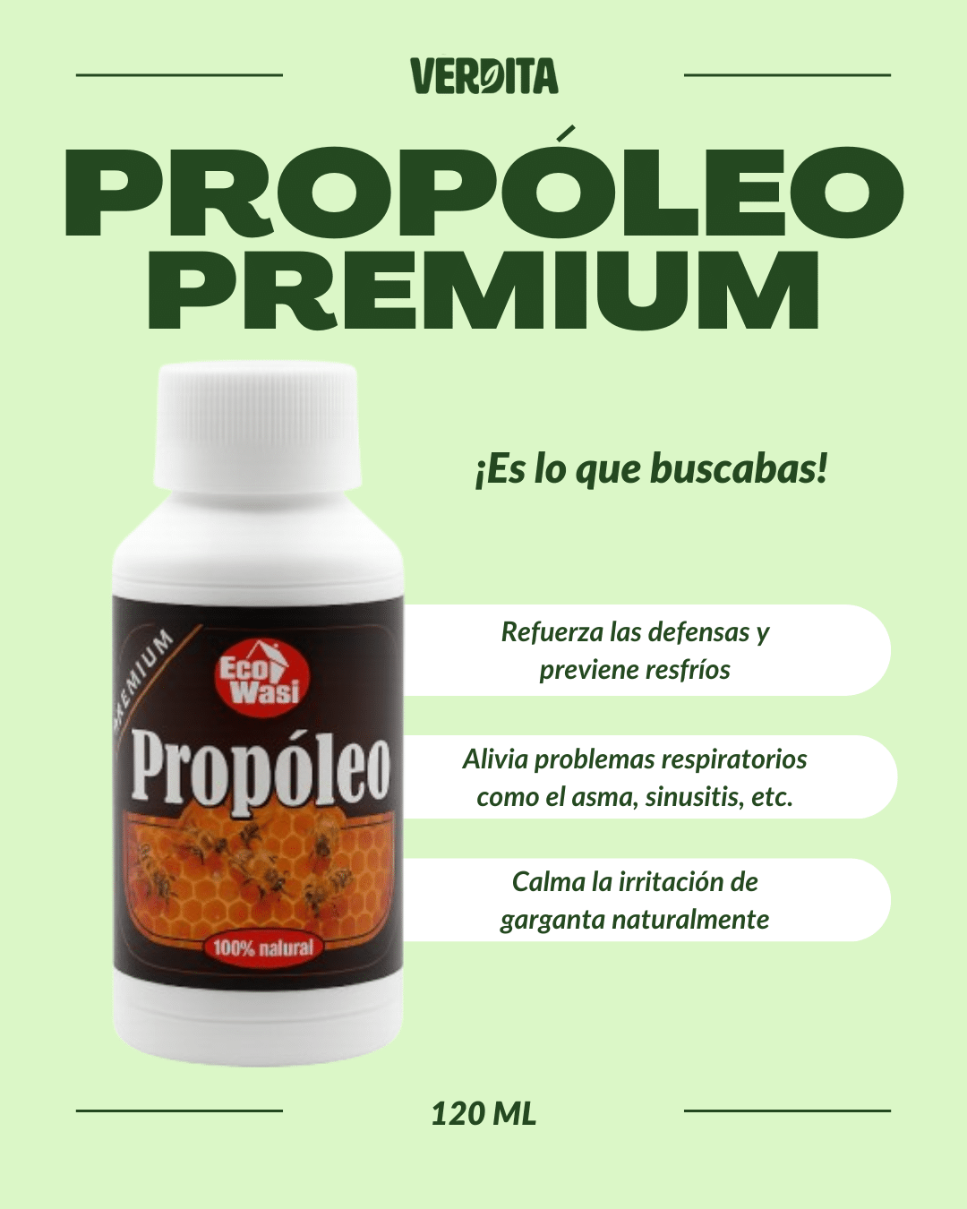 Propoleo Premium es un macerado 100 % propóleo en presentación líquida de 120 ml, reconocido por generaciones como un aliado natural para el bienestar integral. Su practicidad en forma de jarabe lo convierte en una opción sencilla para incorporar a la rutina diaria. Altamente efectivo para mejorar el sistema inmunológico, con capacidades para evitar problemas respiratorios, digestivos y demás molestias, el ideal para llevar una vida más sana y controlar males comunes como asma, bronquitis, sinusitis, etc. Encuentralo ya mismo solo en Verdita donde LO NATURAL SE NOTA!