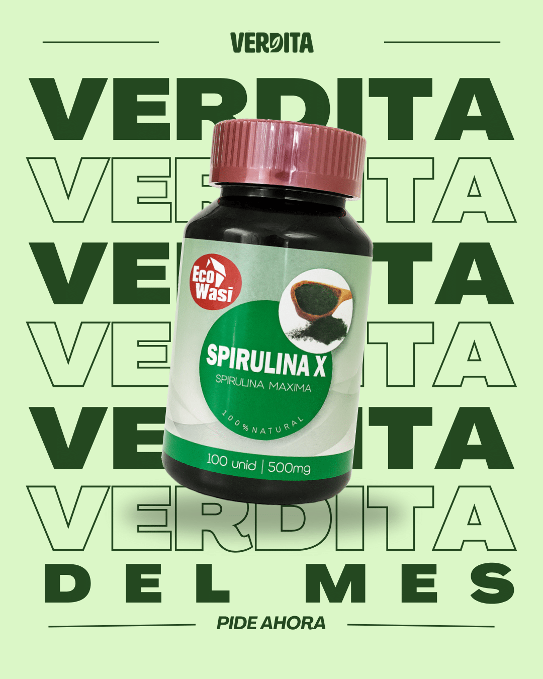 Suplemento natural spirulina en capsulas de mantenimiento nutricional general, elaborado a base de espirulina, berros y alfalfa. Tradicionalmente utilizado para apoyar el equilibrio digestivo, aportar vitalidad y complementar la alimentación diaria de forma natural. Spirulina X en cápsulas de 500 mg es una opción práctica y al alcance de todos que puedes adquirir en Verdita si deseas hacer un cambio totalemente saludable en tu vida, estamos seguros que no te arrepentirás!