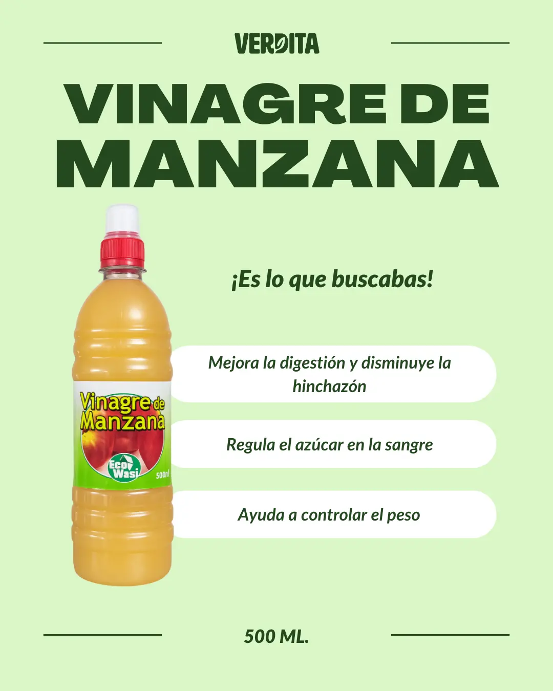 - Formato: Vinagre líquido en botella de vidrio de 500 ml.
